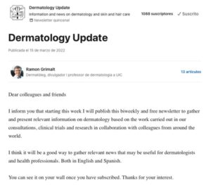 Desde Grimalt Dermatología hemos lanzado una nueva propuesta en la red profesional LinkedIn. Se trata de Dermatology Update, un boletín quincenal con informaciones relevantes sobre dermatología y nuestra actividad tanto en ensayos clínicos, publicaciones científicas y congresos internacionales.